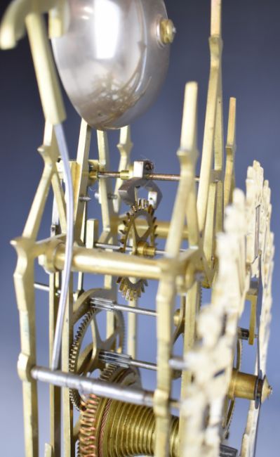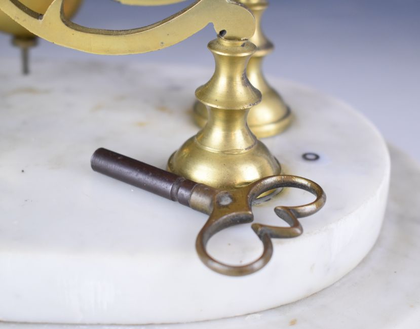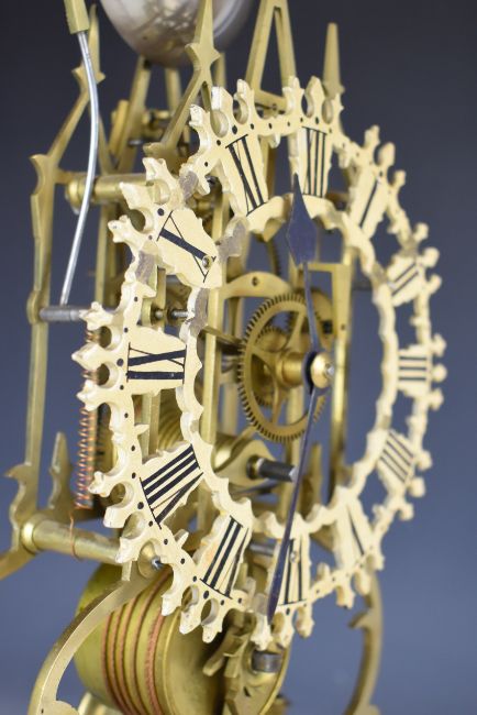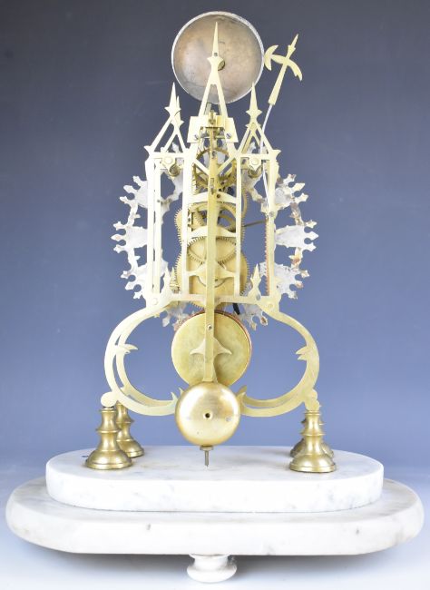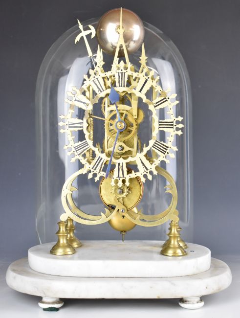 19thC Gothic style skeleton clock with fusee movement, striking on a gong, on white marble base with glass dome, overall height 45cm