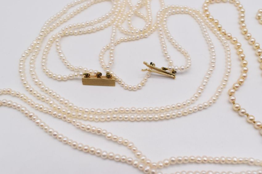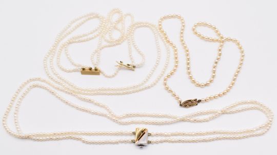 A double strand of cultured pearls with 14ct gold bi-coloured clasp, single strand of cultured pearls with 9ct gold clasp and a triple strand cultured pearl necklace with 14ct gold clasp