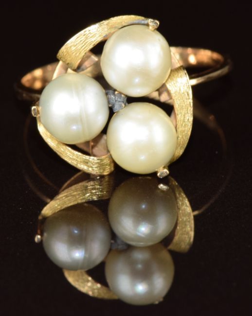 A 9k gold ring set with three cultured pearls, 2.7g, size P