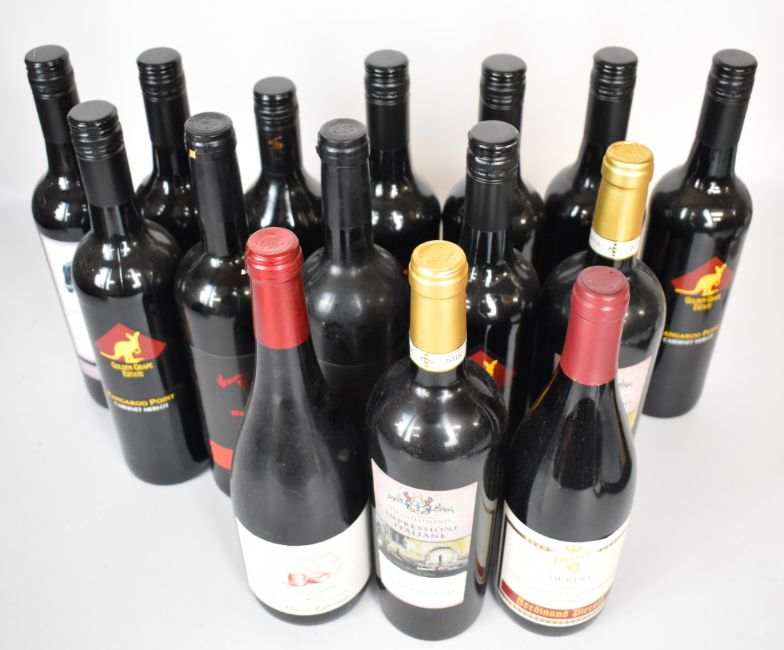 Fifteen bottles of red wine to include Bel Canto Veneto 2014, 11.5% vol. Pieroth Murdei Cabernet Sauvignon / Merlot, 2018, 11.5% and Golden Grape Estate Kangaroo Point Cabernet Merlot, 13.5%, all 75cl. PLEASE NOTE ALL ALCOHOL & TOBACCO ITEMS ARE SUBJECT TO OVER 18 CHECK ON COLLECTION OR DELIVERY