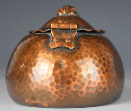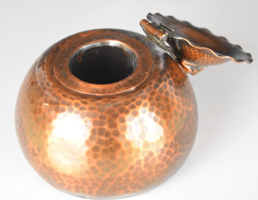 Arts & Crafts style hammered copper inkwell with frog finial, height 8cm