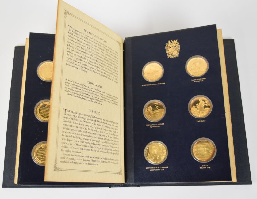 Churchill Centenary Trustees Edition hallmarked silver gilt medal set by John Pinches comprising 24 medallions, each hallmarked and numbered to rim, depicting key events in Churchill's life, in presentation folder with certificate to front named to Captain J.S.Scott MM and numbered 5628, weight of all medals 620g