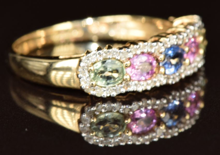 A 9k gold ring set with oval cut green, pink and blue sapphires surrounded by diamonds, 2.6g, size P