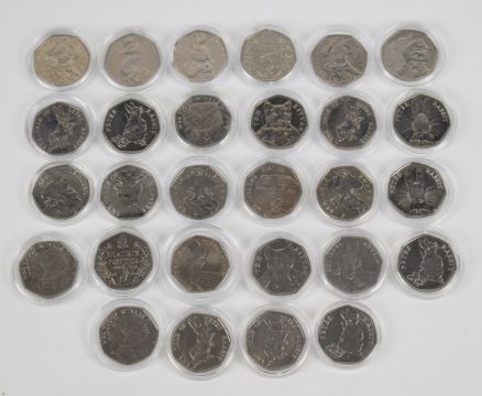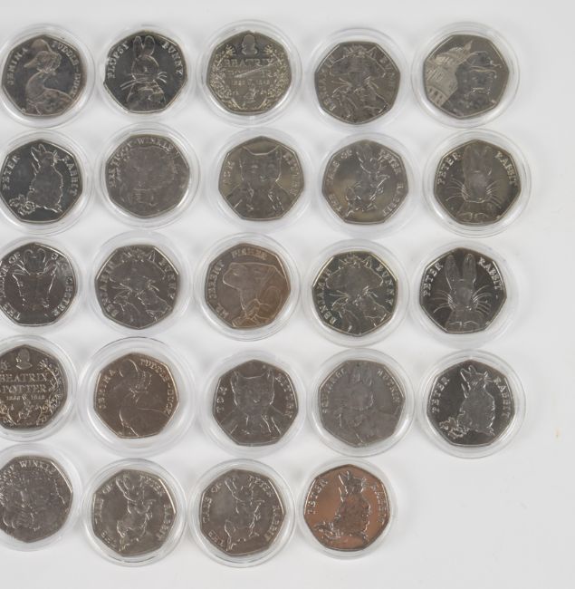 Twenty eight Beatrix Potter 50p coins, in coin capsules all near uncirculated