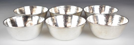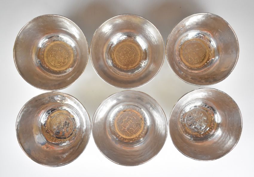 Set of six Sudanese silver bowls, each with script decoration to insides and also marked to underside, believed to be the signatures of the Sudanese doctors who gave them as a present to the vendor's ancestor, diameter 11.5cm, weight 879g