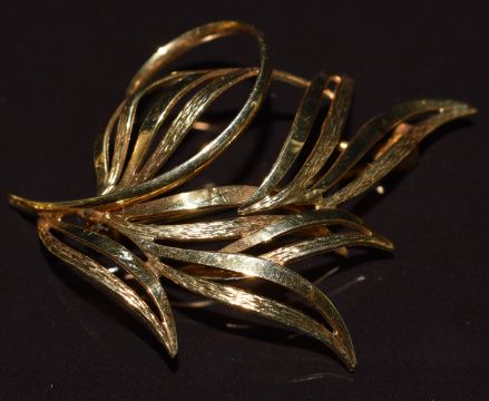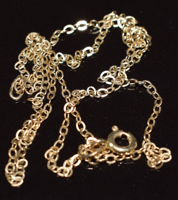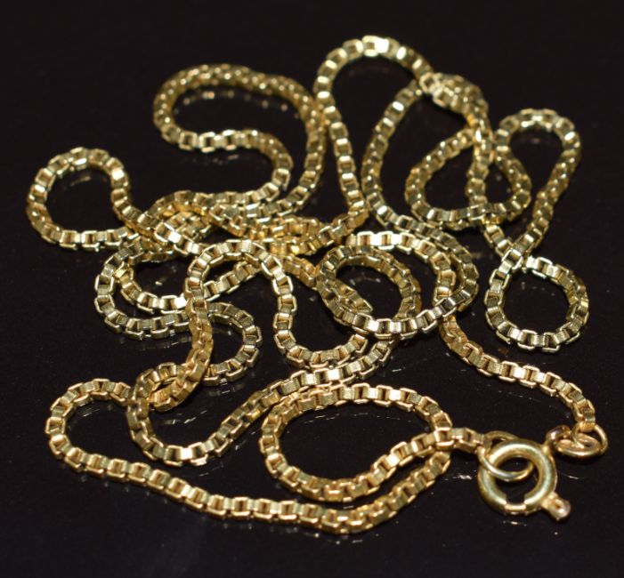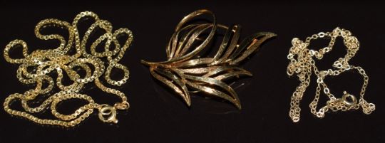 A 9ct gold necklace/ chain made up of square links (60cm), 9ct gold chain and 9ct gold brooch (4.5cm), 12.8g