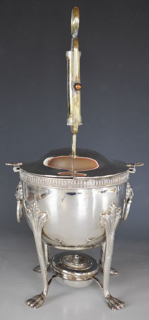 Silver plated novelty egg coddler with spirit burner below and mount for timer to top, in the classical style with lion paw feet, height 39cm
