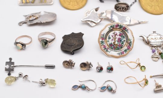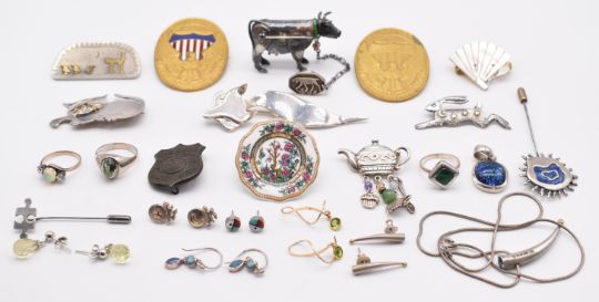 A collection of silver jewellery including ring set with malachite, brooch depicting a cat and birds engraved 'behind you' marked TMF, stylised fox brooch, cat brooch, stick pin, ring set with moss agate, designer necklace and earrings set with zircon, hare brooch, earrings, etc