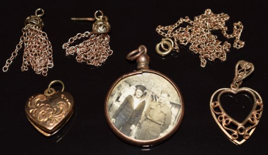 Edwardian 1902 9ct rose gold locket, 9ct gold heart pendant, 9ct gold heart locket and two 9ct gold tassel charms (4.9g)