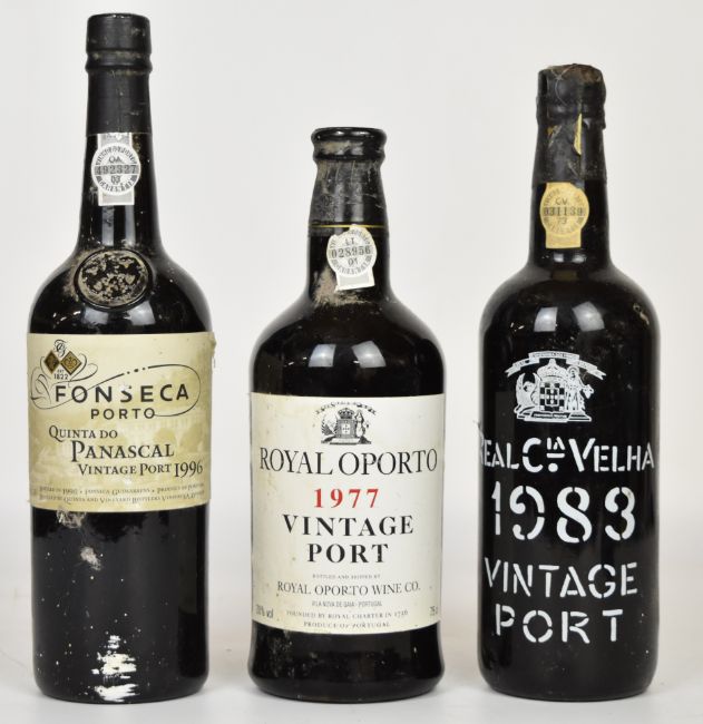 Three bottles of vintage port Royal Oporto 1977 750ml 20% vol, Real Companhia Velha 1983 750ml 20% vol and Fonseca Quinta Do Panascal 1996 750ml 20.5% vol.  PLEASE NOTE ALL ALCOHOL & TOBACCO ITEMS ARE SUBJECT TO OVER 18 CHECK ON COLLECTION OR DELIVERY