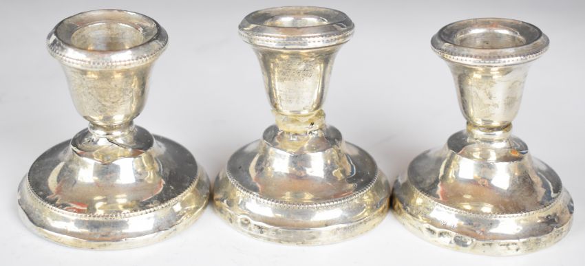 Hallmarked silver mounted items to include hand mirror, brushes, candlesticks, manicure set or hat pin stand, ashtray, sugar nips, two folding mother of pearl handled fruit knives and a vintage H.A.Dosser Weston-Super-Mare box