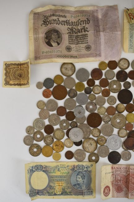A collection of overseas coinage 19thC onwards, USA Indian head, emergency coinage includes silver content, together with some banknotes including German inflationary etc