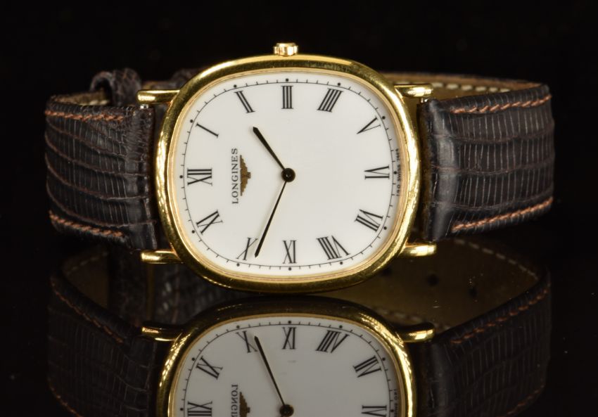Longines gentleman's wristwatch ref. L4.624.2 with gold hands, black Roman numerals, white dial, gold plated case and quartz movement, on black leather strap, case diameter 30mm, serial number 26739780.