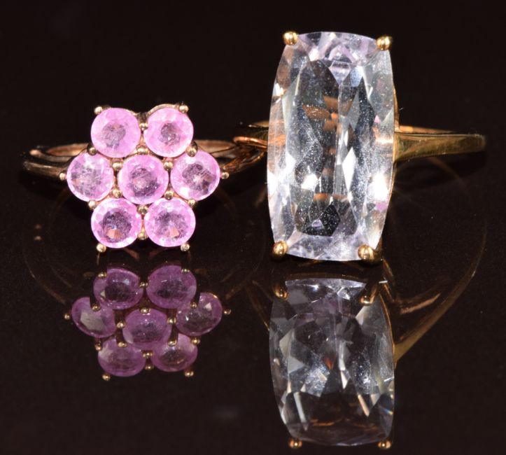 Two 9ct gold rings, one set with pink sapphires and the other quartz, 5.8g, size S & J