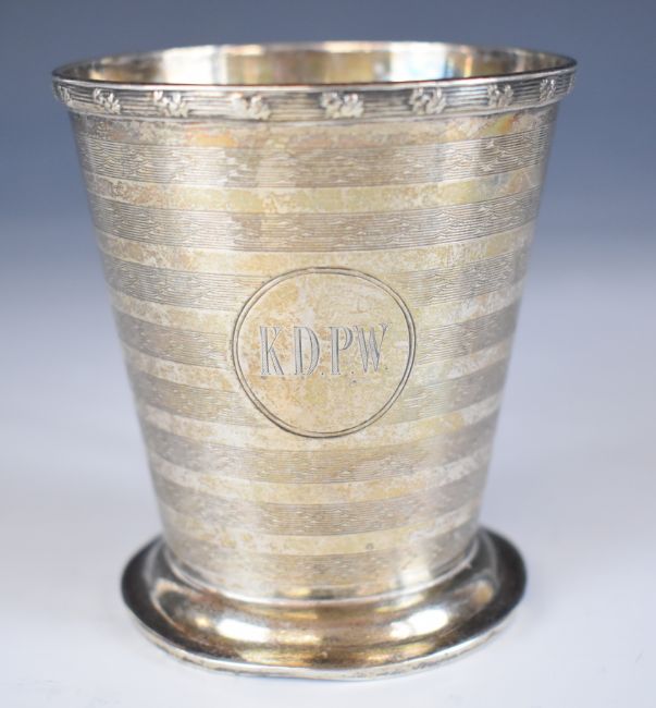 Art Deco Walker & Hall hallmarked silver mug of tapering form with engine turned decoration, Sheffield 1923, height 8.5cm, weight 120g