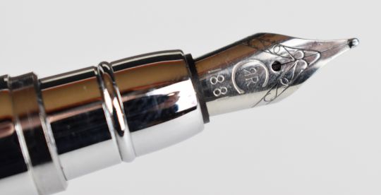 Two fountain pens one Cerruti with stainless steel body and cap and 1881 nib (in original box), the other Wallor St Claude with blue and bronze lacquer body and cap, gold plated fittings and Iridium Point nib, in Cross box