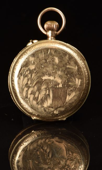 Swiss 9ct gold keyless winding open faced pocket watch with blued hands, black Roman numerals, engraved gold dial and case and unsigned movement, case diameter 29mm, serial number 88058, 20.8g.