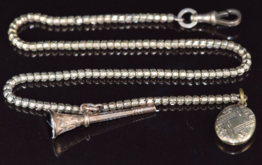A yellow metal Albert / watch chain (testing as 9ct) with locket and watch key set with banded agate, 9g, 34cm
