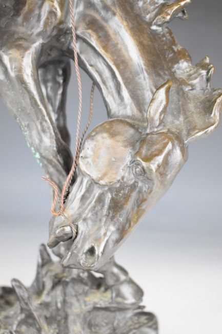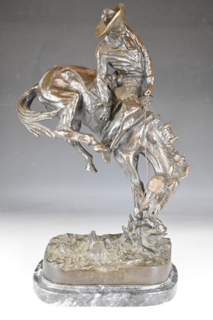 After Frederic Remington bronze figure of a cowboy on a rearing horse, signed to base, overall height 62cm
