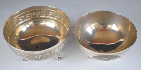 Two silver bowls, both raised on three feet, one with Greek key style decoration, both marked 830, diameter 11cm, weight of both 221g