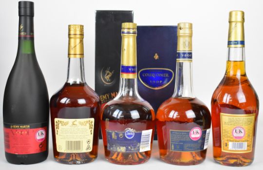 Five bottles of Cognac comprising Courvoisier x2, Hennessy, Martell and Rémy Martin Fine Champagne Cognac, all 70cl and 40% vol. PLEASE NOTE ALL ALCOHOL & TOBACCO ITEMS ARE SUBJECT TO OVER 18 CHECK ON COLLECTION OR DELIVERY