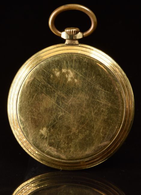 Marvin Art Deco gold plated keyless winding open faced pocket watch with blued hands, black Arabic numerals, gold dial and signed 15 jewel movement, case diameter 48mm, serial number 851.