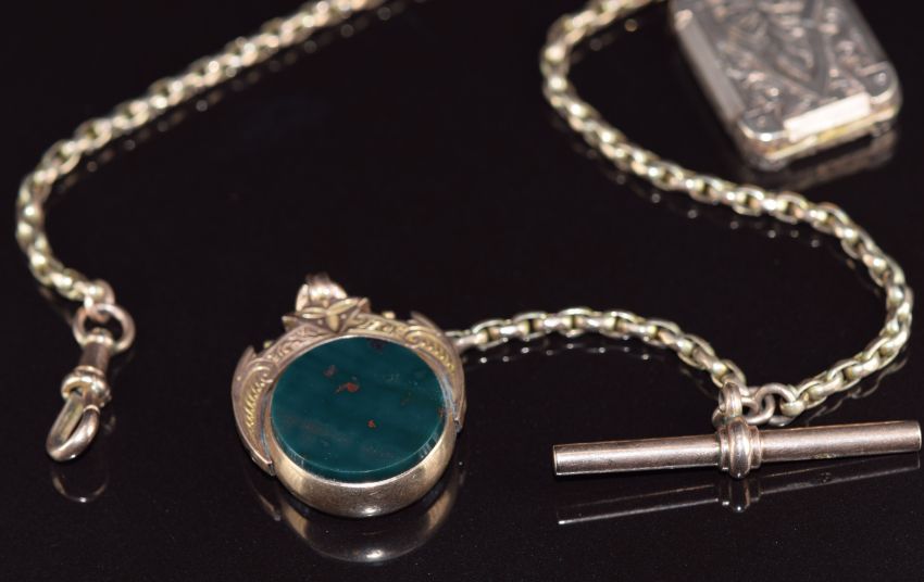 A 9ct rose gold Albert / watch chain with 9ct rose gold swivel fob set with agate and locket, 21.2g, 28cm