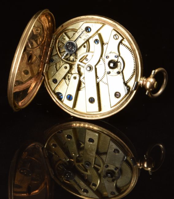 Unnamed 14ct gold open faced pocket watch with blued hands, black Roman numerals, engraved gold dial and case and unsigned movement, case diameter 34mm, serial number 98836, 24.6g.