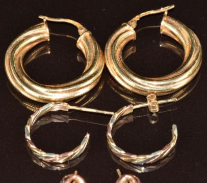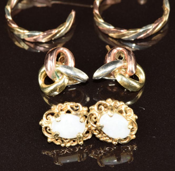 Four pairs of 9ct gold earrings including hoops, opal set and knots, 6.3g