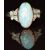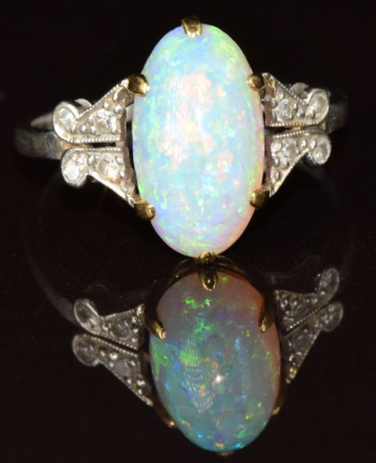 A platinum ring set with an opal cabochon and diamonds to the shoulders, 3.5g, size M