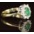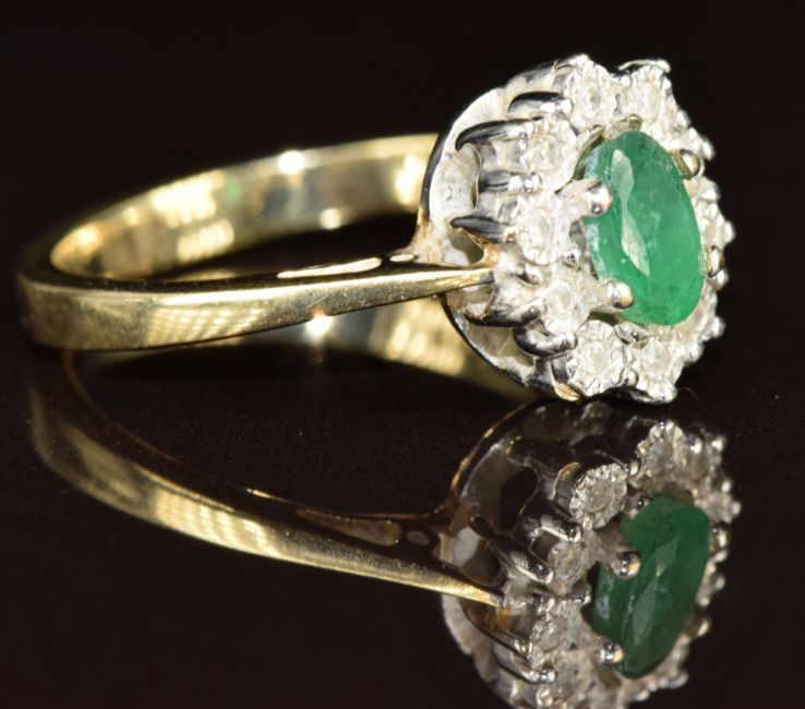 A 9ct gold ring set with an oval cut emerald surrounded by diamonds, 3g, size K