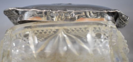 Hallmarked silver mounted and lidded items including a pair of cut glass dressing table pots, peppers with blue glass liners, comb, candlestick and miniature photograph frame
