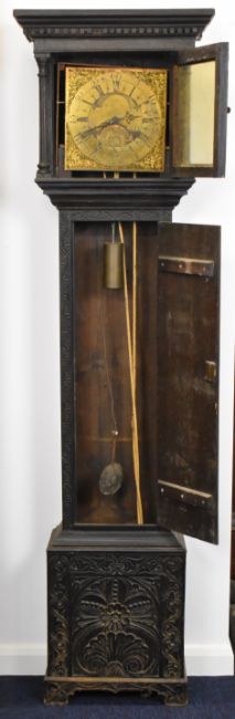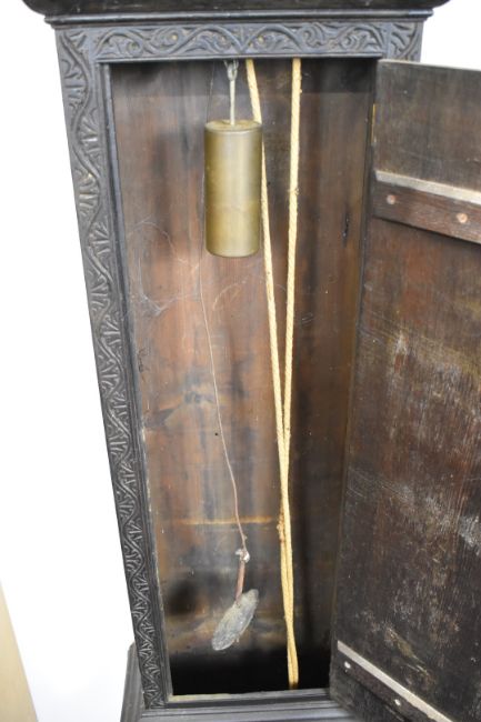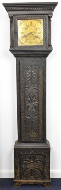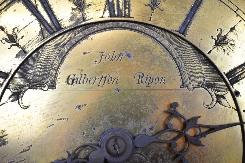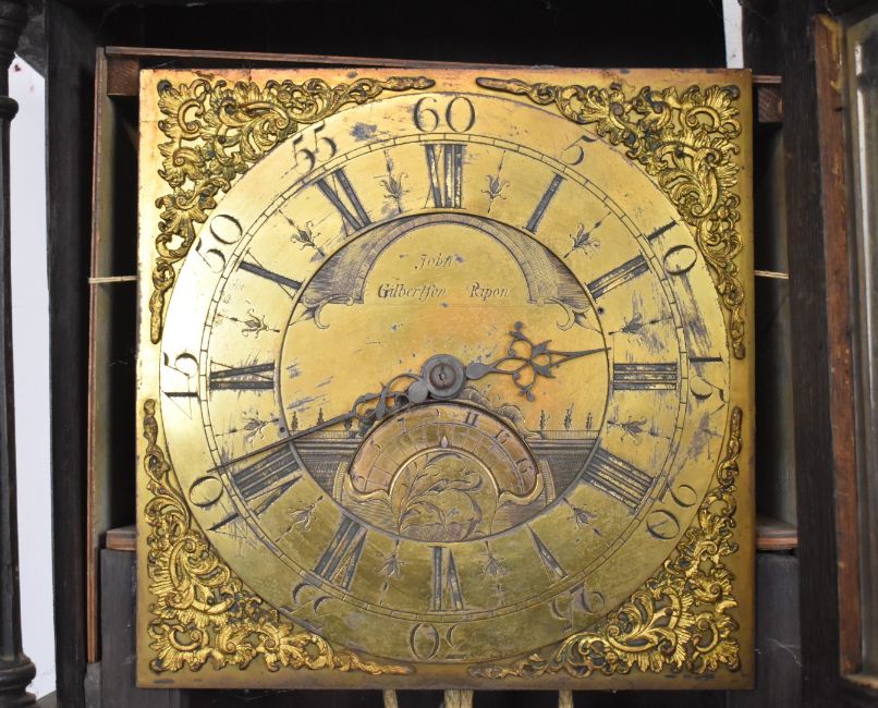 John Gibertson, Ripon brass dial 30 hour longcase clock with carved oak case, width of dial 28cm, overall height 198cm