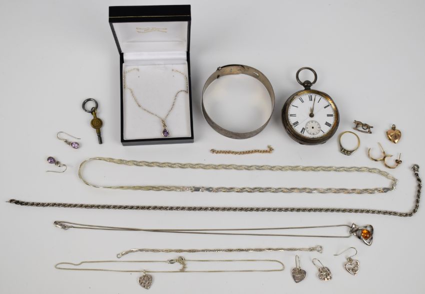 A collection of silver jewellery including bangle, five necklaces, two pairs of earrings and a pocket watch, together with 9ct gold back and front locket 18ct gold and platinum ring (damaged), and a pair of 9ct gold earrings