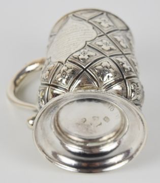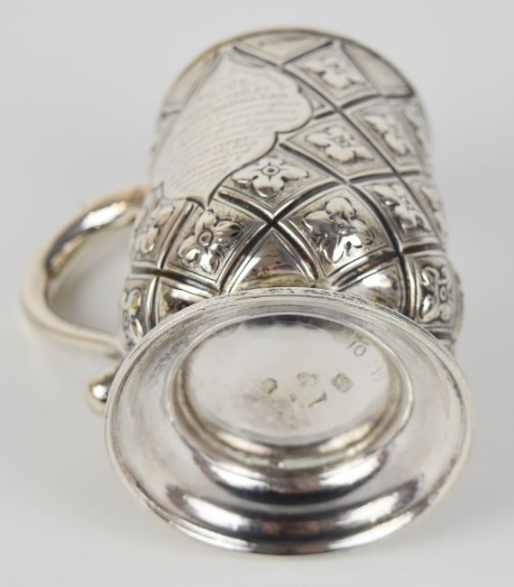 George I hallmarked silver pint tankard with scroll handle, geometric embossed design and inscription for the Brecknockshire Agricultural Society 1865, the Georgian tankard hallmarked for London 1728, maker Charles Martin, height 12cm, weight 318g