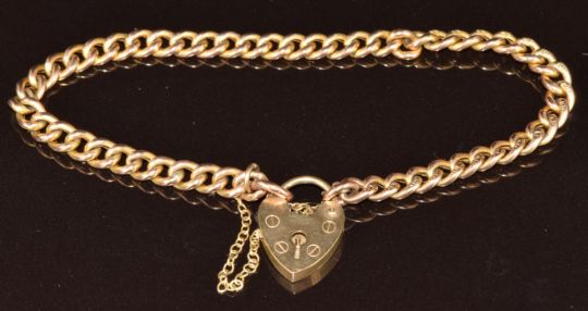 A 9ct gold curb link bracelet with heart padlock clasp, 6.2g, 17.5cm