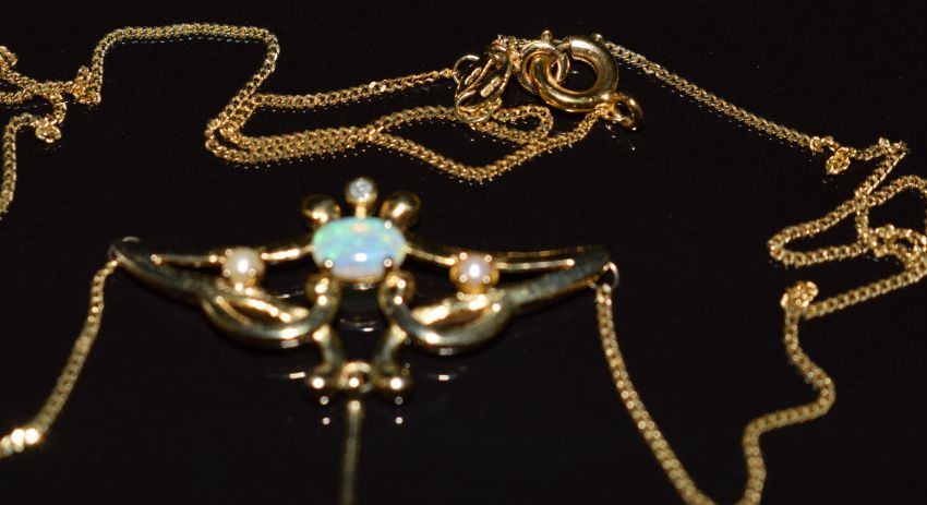 A 9ct gold necklace set with opals, a diamond and two seed pearls, 3.7g, 40cm