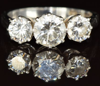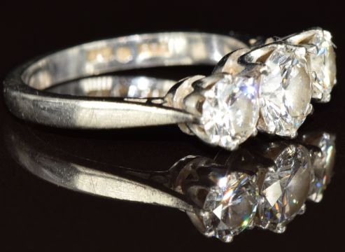 A platinum ring set with three round cut diamonds of approximately 0.8ct, 0.38ct and 0.44ct, 4.4g, size J