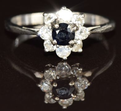 An 18ct white gold ring set with a sapphire surrounded by diamonds, 2.1g, size J