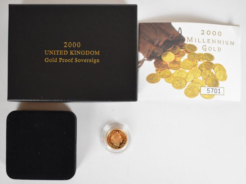 2000 Queen Elizabeth II Millennium proof gold full sovereign, in original Royal Mint case with certificate number 5701