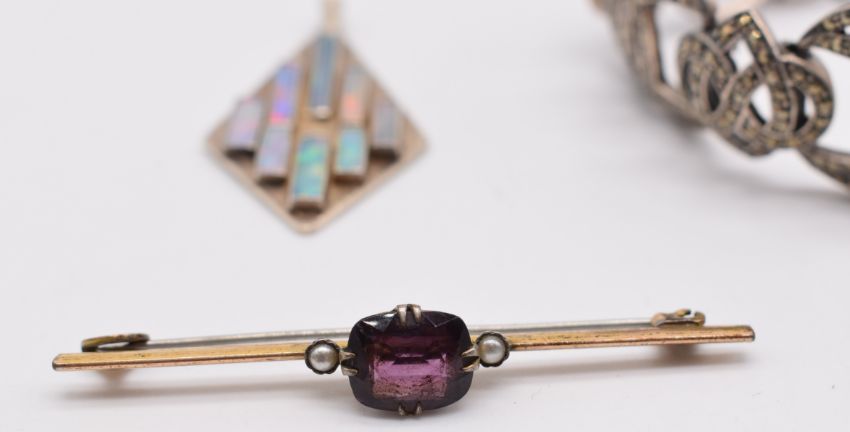 A silver bracelet set with marcasite, silver pendant set with opals, chain and brooch
