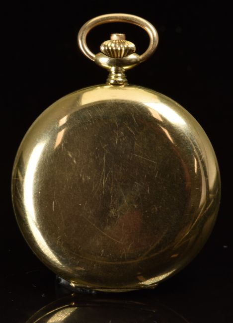Viking gold plated keyless winding full hunter pocket watch with subsidiary seconds dial, blued Breguet hands, Arabic numerals, gold dial and signed calibre 527 movement, case diameter 52mm, serial number 1485111.