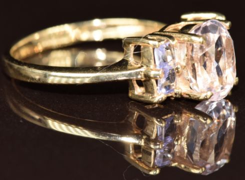 A 9k gold ring set with an oval cut morganite and tanzanite, 2.5g, size N