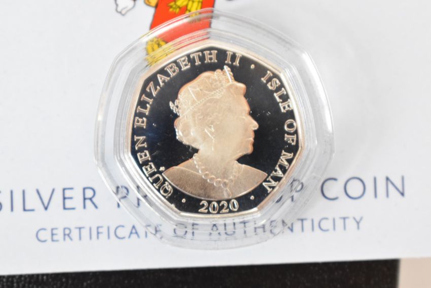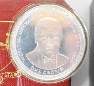 Three cased coins including silver Churchill crown