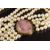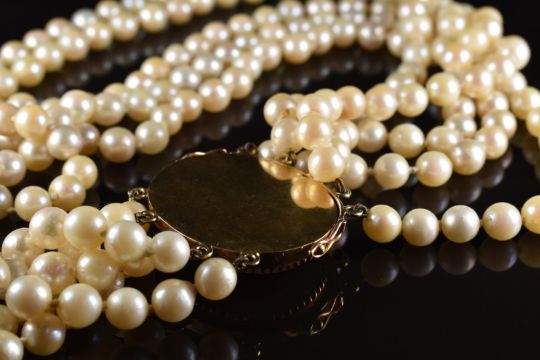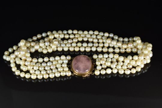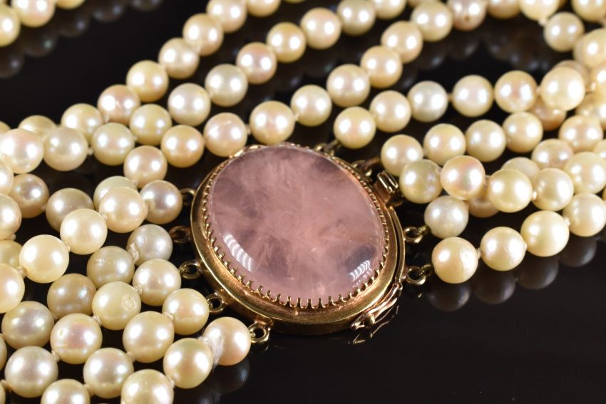 A five strand pearl necklace with 14k gold oval clasp set with a rose quartz cabochon, 132g, 42cm long