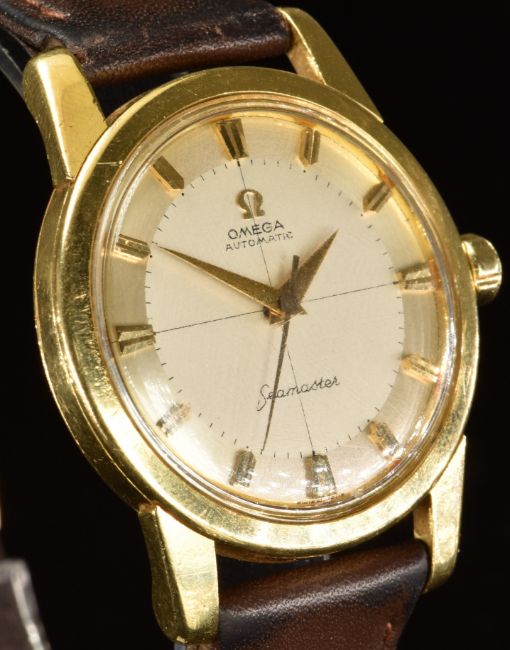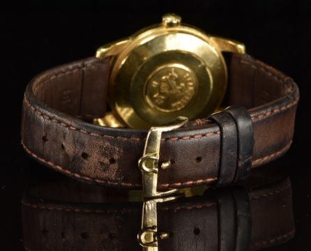 Omega Seamaster 18ct gold gentleman's automatic wristwatch ref. 2846/ 2848 with gold hands and hour markers, silver dial and signed 20 jewel calibre 501 movement, on brown leather strap, case diameter 34mm, serial number 16678319.