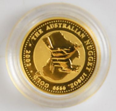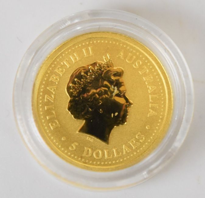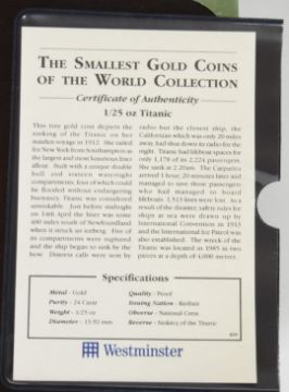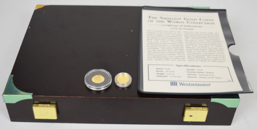 Westminster Coins miniature 24ct gold 1998 Titanic commemorative $10, 1.3g and a 2002 Australian $5 1/20 oz 9999 gold coin, contained in a fitted Westminster collector's case, one with certificate