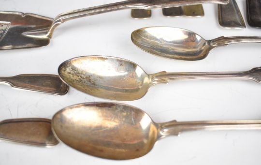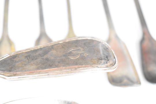 Victorian hallmarked silver six place setting fiddle and thread pattern canteen of cutlery comprising six each of table spoons, dessert spoons, table forks and dessert forks, together with a fish slice, all London 1838, maker Mary Chawner, length of table spoons 22.5cm, weight of all items 1916g