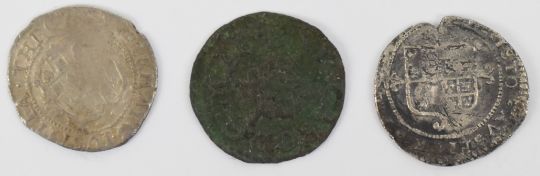 Charles II 1660-62 half groat together with Charles I penny and a Maltravers copper farthing