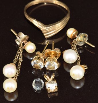 A 9ct gold ring (1.2g, size O), a pair of 9ct gold earrings set with pearls, further 9ct gold earrings, pendant and a loose oval cut aquamarine